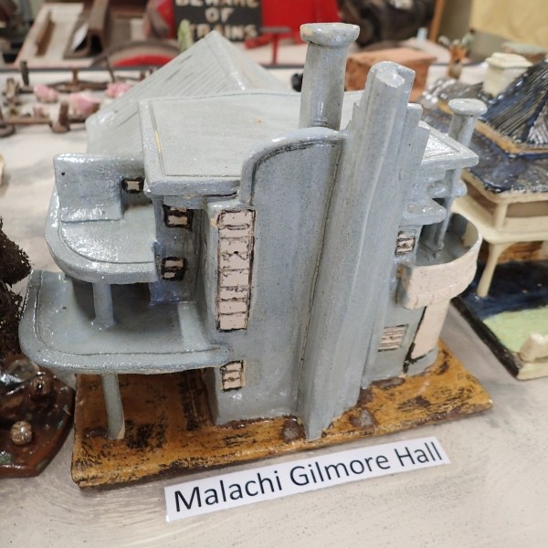 Pyneboard donated wood for the base and the “workers” spent several months building, painting and decorating a papier mache base, before starting on pottery replicas of buildings like the Malachi Gilmore Hall, Ramsgate, Nurse Fox’s home, the Post Office, and Cashins store, just to mention a few, as well as numerous animals, and lots of backyard dunnies!
