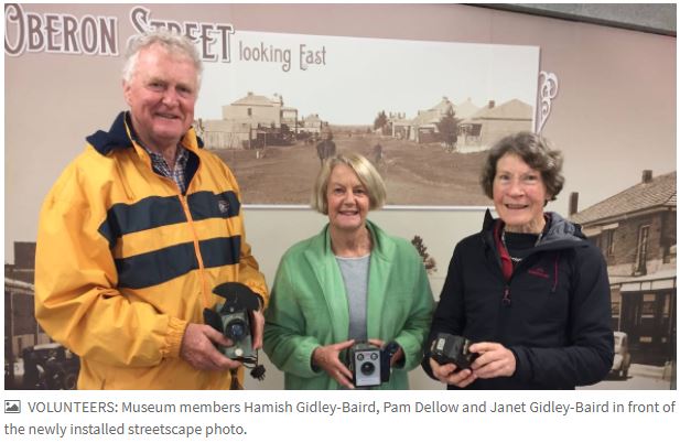 The photo below is one of the results of funding received from Oberon Council as part of a Museums and Markets Trail which is being co-ordinated by Councils Development Officer, Mathew Webb. Mark, from Marks Signage, has done a wonderful job enlarging two photos so that they fill a whole wall behind the 1930s streetscape. The smaller insert is an early shot of the Main Street looking east and the larger photo is looking east again, probably sometime in the 1940s.