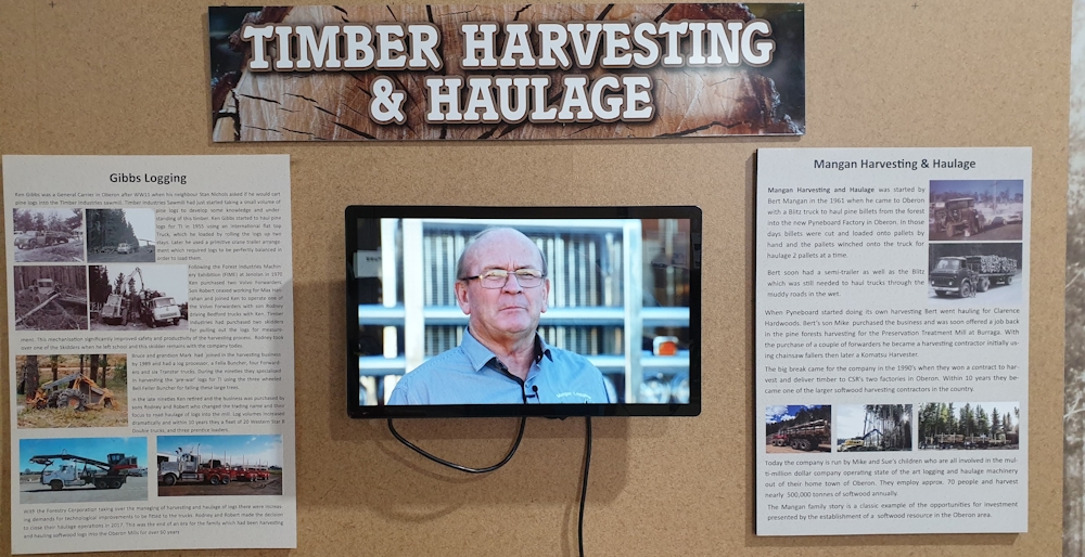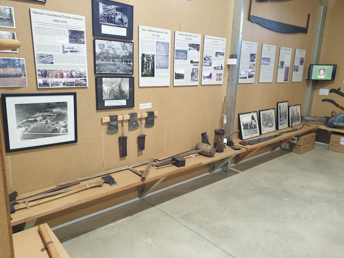 Oberon is at the centre of some 65,000 hectares of softwood plantation. The museum’s Forest & Timber display provides an overview of the history of the timber industry in the Oberon district. It features displays by the Forestry Corporation, and Borg Panels, and a custom made video of Mangan Harvesting and Haulage undertaking mechanical harvesting in the plantation. There are numerous panels and photos interpreting and depicting the history of the plantation establishment era. Audio visual screens assist the story telling, and present a collection of photos and archived film. Numerous forestry tools, saws and sundry items, including a heavy horse in harness, help to tell the story.